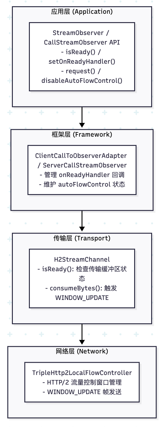 disableAutoFlowControl() / disableAutoInboundFlowControl() - 禁用自动流量控制disableAutoRequestWithInitial(int) - 客户端专用,禁用自动请求并设置初始请求数量disableAutoRequest() - 服务端专用,禁用自动请求request(int) - 手动请求指定数量的消息Triple 背压机制基于 HTTP/2 的流量控制能力实现,涉及以下几个层次: